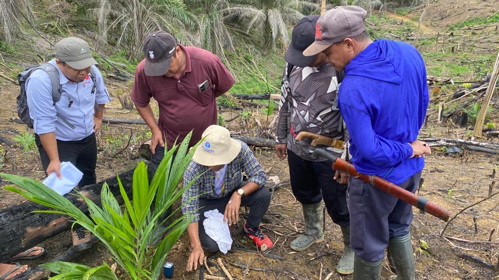 Kegiatan pendampingan diawali dengan melakukan peninjauan langsung ke lahan yang telah menerapkan jarak tanam sistem mata lima yang diterapkan oleh petani. Berdasarkan hasil pemantauan ditemukan beberapa hal yang masih keliru, contohnya adalah ukuran jarak yang digunakan tidak sesuai dengan patokan arah mata angin. Hal ini menyebabkan tidak terbentuknya pola mata lima pada pertanaman kelapa sawit, sehingga akan berakibat pelepah antar pohon kelapa sawit akan saling menutupi. Hal tersebut menyebabkan kurang maksimalnya penyerapan sinar matahari oleh pohon kelapa sawit. Bapak Hotma Tarigan memberikan evaluasi serta rekomendasi perbaikan terkait dengan kekeliruan yang terjadi dalam pemancangan sistem mata lima tersebut.